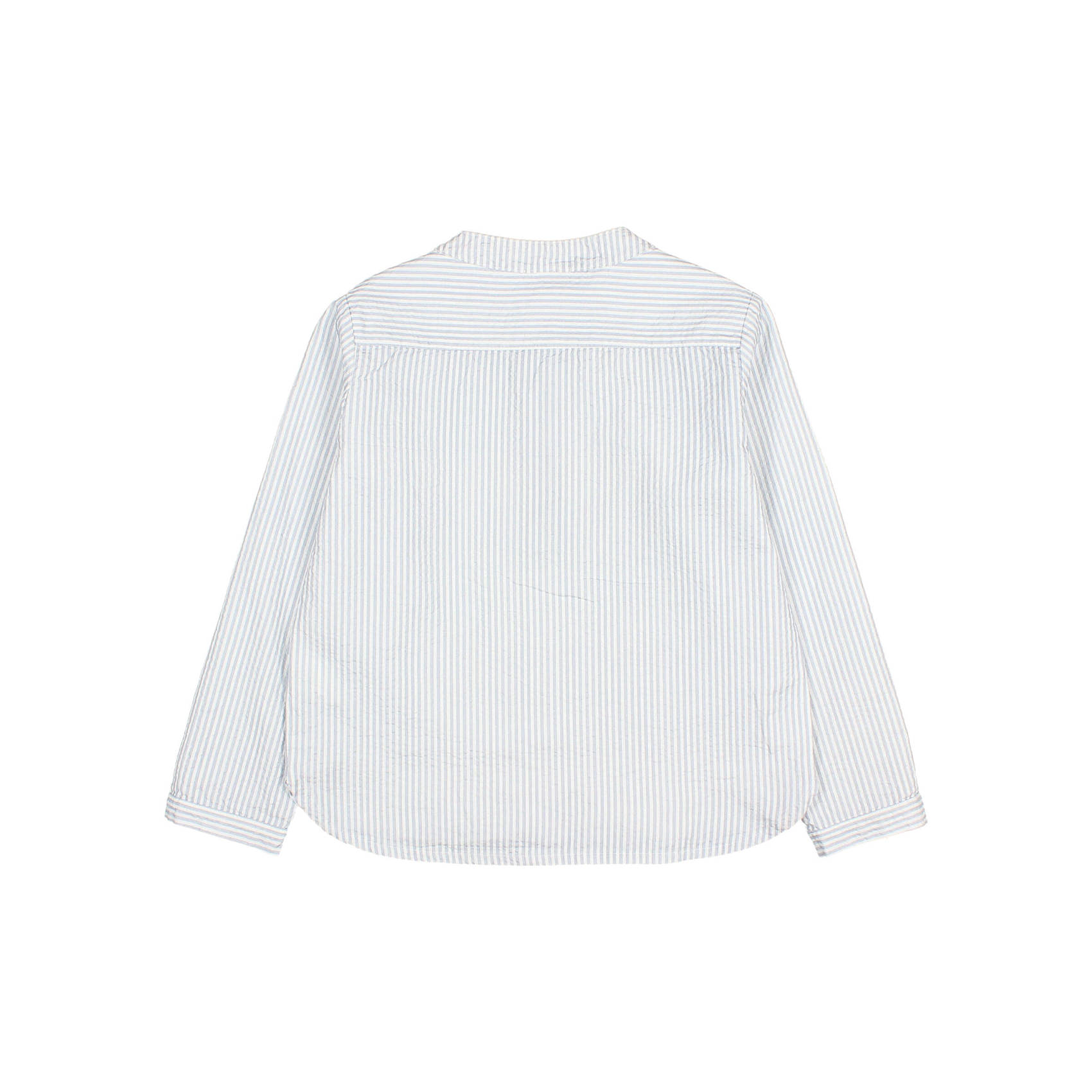Long-sleeved cotton seersucker shirt with striped print. Mao collar. Button fastening on chest with wooden buttons. Contrasting embroidered detail on the side of the hem.