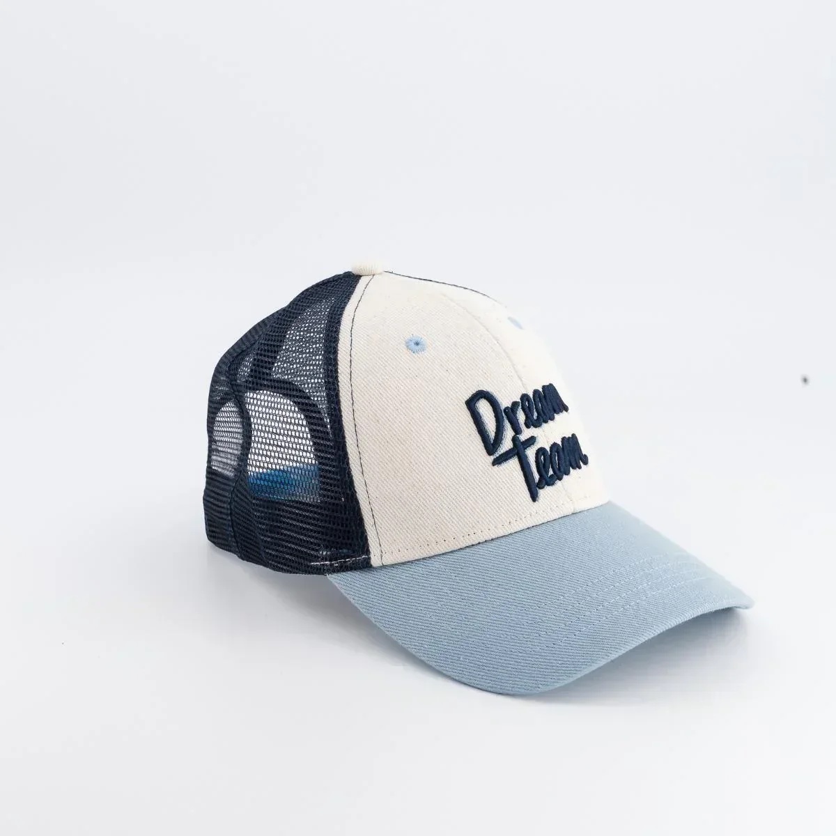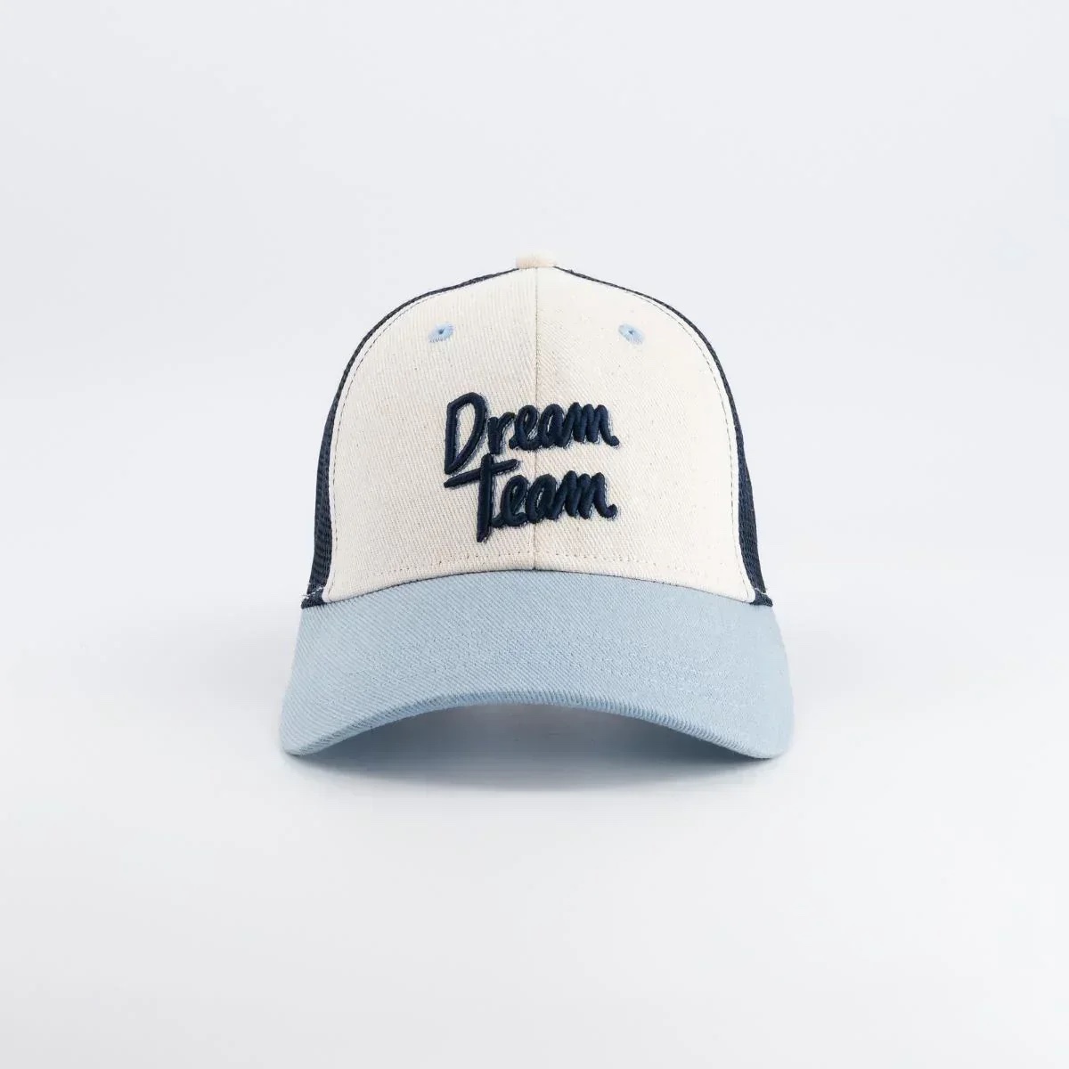Couleurs : crème, visière bleue, filet bleu marine