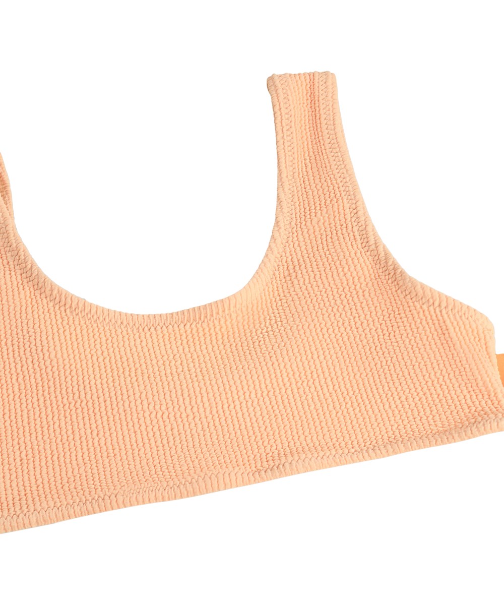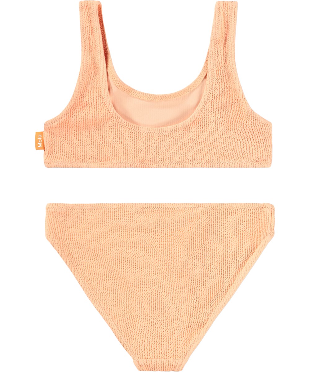 Bikini orange en crêpe stretch avec motif texturé et protection UV 50+. Le bikini est doté d’un haut large, de larges bretelles, d’un dos profond et est entièrement doublé. Le bas est doté d’une taille élastiquée, d’une coupe classique et est également entièrement doublé.