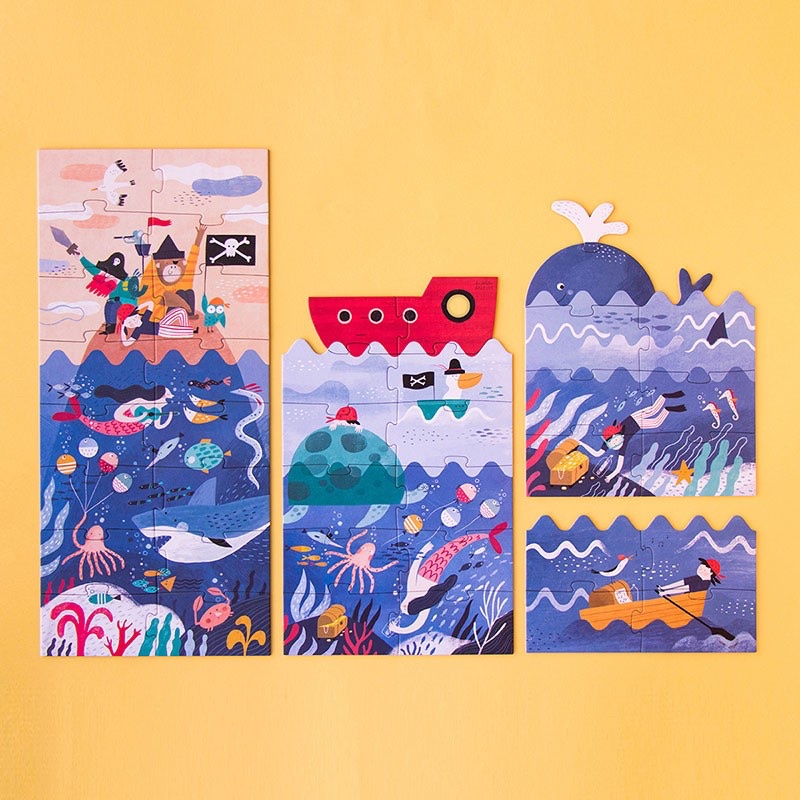 Un ensemble de puzzles de pirates et de trésors de 4, 8, 12 et 16 pièces qui se montent par couches, du plus grand au plus petit.